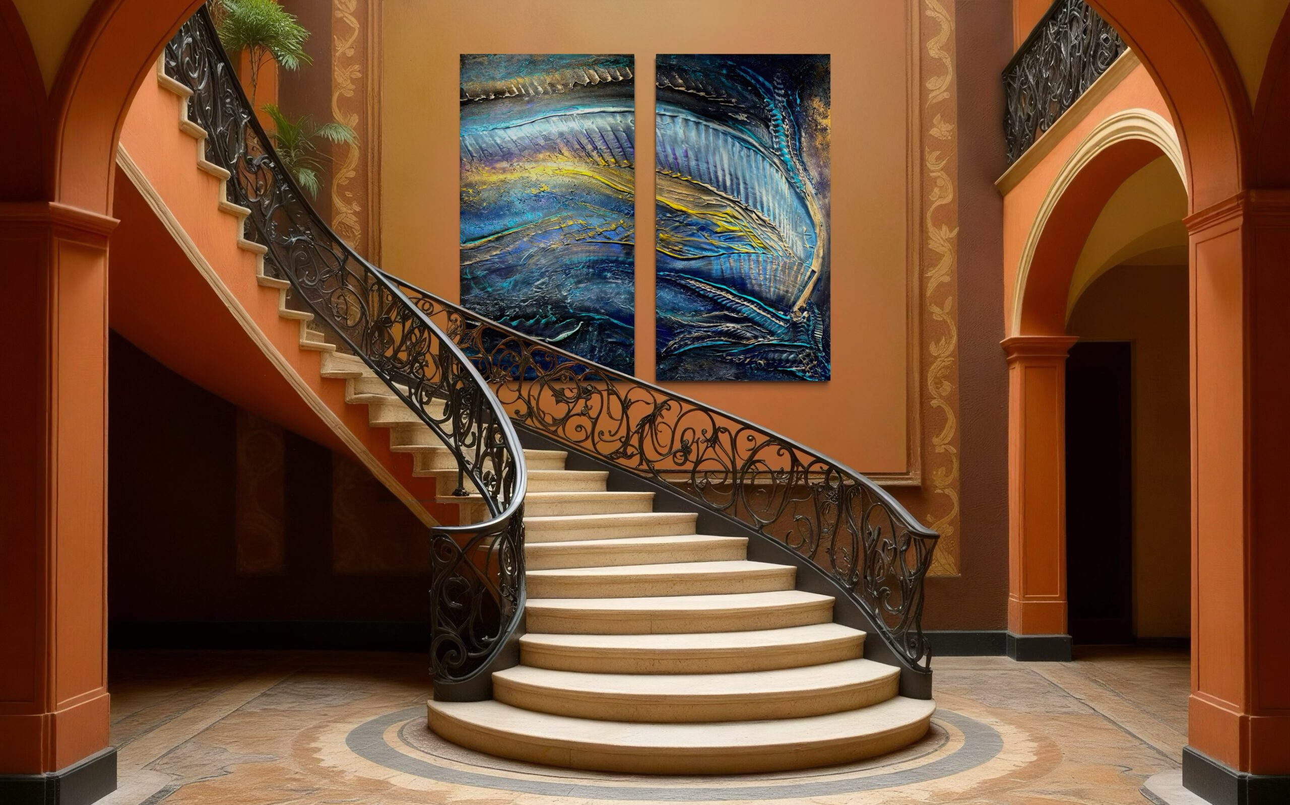 Formen erinnern an Wasserströmungen, Galaxien oder kosmische Energiefelder. Die Oberflächen wirken gleichzeitig kraftvoll und ruhig – wie ein Moment zwischen Bewegung und Stille.